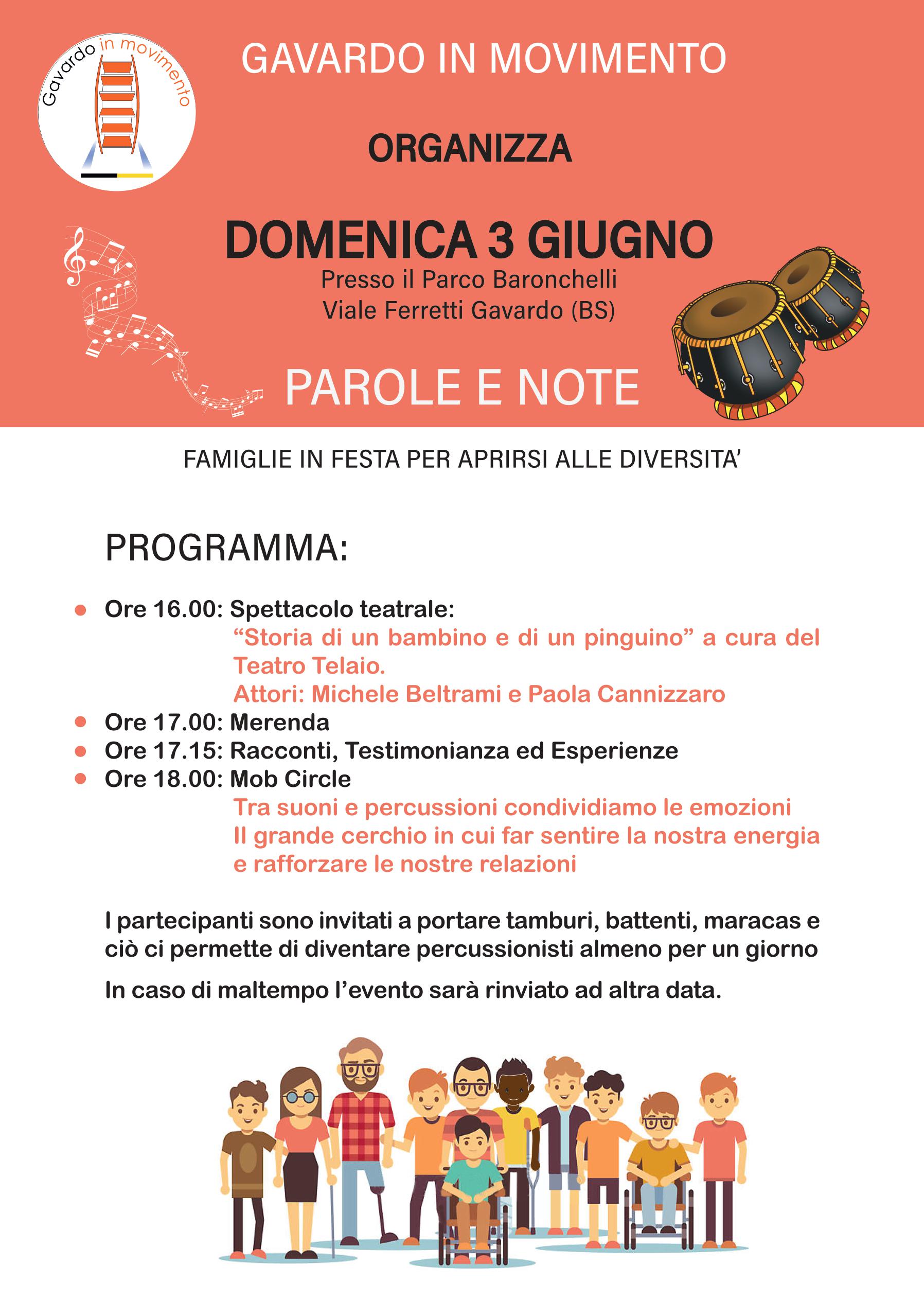 Gavardo in movimento invita tutti a partecipare all’evento “Parole e Note”, domenica 3 Giugno presso il Parco Baronchelli di Gavardo (Viale Ferretti)