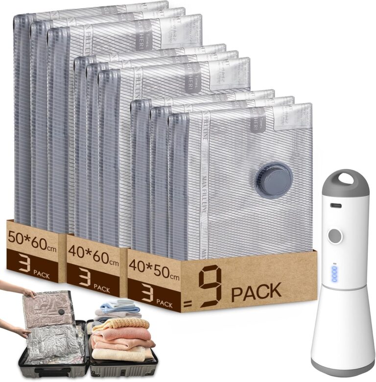 Scopri Sacchetti Sottovuoto Vestiti con Pompa Sottovuoto Senza Fili, 9 Pezzi: riduci l’ingombro in pochi secondi e proteggi i tuoi capi da polvere, umidità e odori in ogni viaggio e cambio stagione